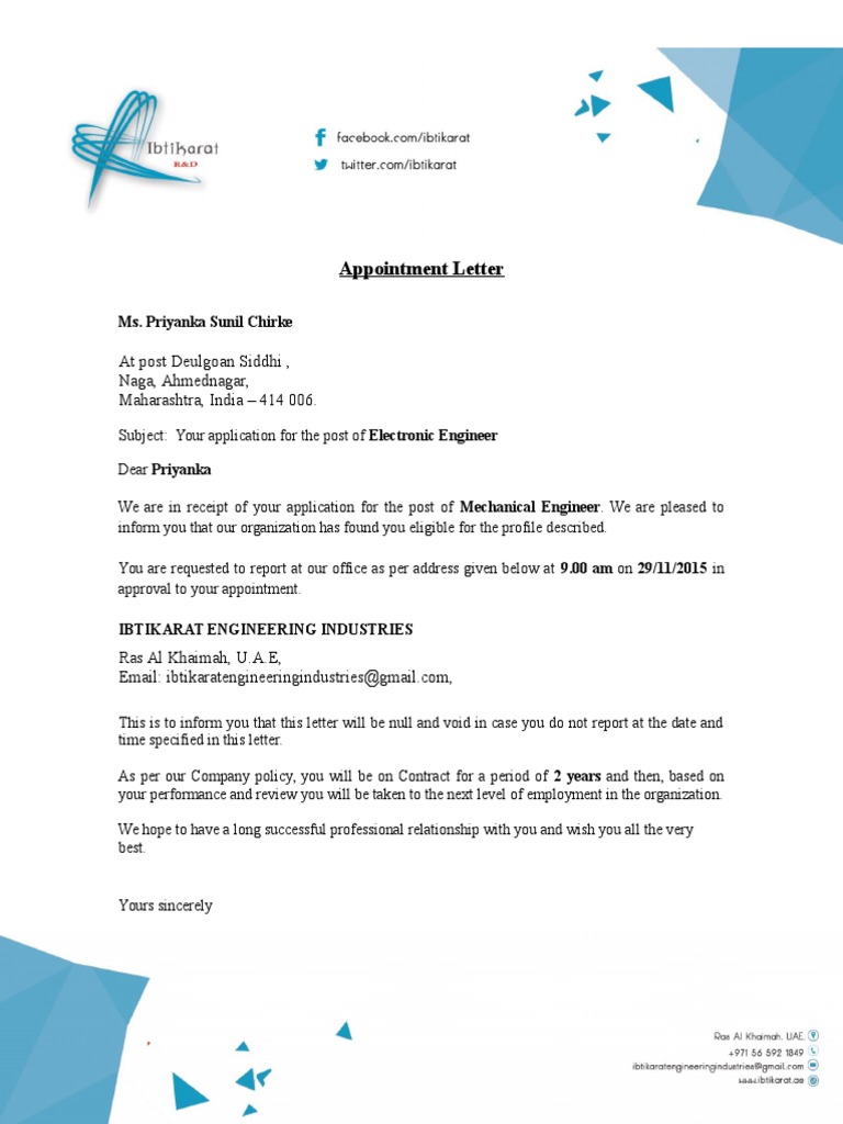 An official appointment letter should contain the day of commencing your job, your role in the job, salary. Appointment letters must provide all the information necessary for employees to start working for the company. Pursuant to the recommendation of the nomination and remuneration committee, the board of directors of oracle financial services software limited (the company) has approved your appointment as an. The appointment letter goes into enormous detail of what is predictable of the new employee and the role they will cooperate in the company. Model letter of appointment for independent directors. Make sure to include your contact information, even if you included it in your first letter when scheduling the original appointment. An appointment letter can also mean a legally binding document that appoints an individual to a specific designation or position. Appointment letters to business partners. I was interested in the advertisement in the newspaper (magazine) on 21 march and i would like to apply for the post of a regional manager/ i saw your advertisement in the daily news (life magazine) and i was interested in the position of a sales. I created this video to served as a guide to my fellow filipino. Do not speak too much about what you want. If any employee, indiviual, officer needs to get an appointment from any other manager email request for doctor meeting appointment. Example letters for offering employment to the person selected for a job.